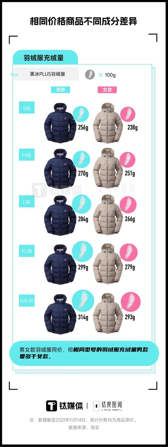 同款同价商品,质量和商品成分却不同,这也是如今“粉红税”的一种表现形式。据钛媒体·钛度图闻观察,在电商平台上,男女同款的某品牌羽绒服价格相同,但如果仔细看羽绒服的充绒量,会发现同尺码的羽绒服,女款羽绒服的充绒量远低于男款,从S码-XXL码,女款羽绒服充绒量比男款低18g-21g。