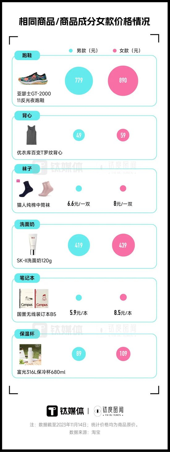 据钛媒体·钛度图闻不完全统计,最常见的情况有衣服类产品,比如亚瑟士的一款跑鞋,同型号同颜色女款价格要比男款贵111元,这并不是孤例,同为衣物类的背心、袜子等,还有洗面奶、保温杯等日用品,部分产品女款价格均高于男款,差价在1.4元-20元间。