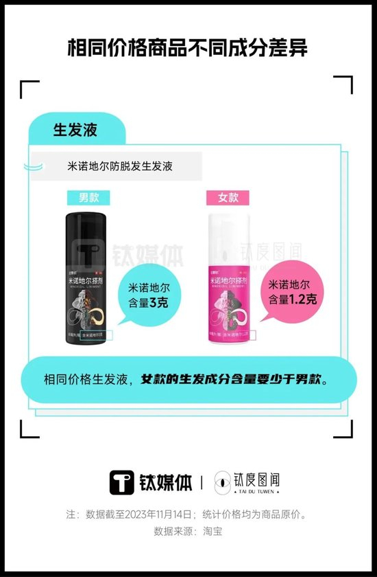 类似的情况还出现在钙片品牌上。在钙片的26个男女相同的营养成分上,有12个成分男款比女款含量高,女款含量比男款高的成分仅有2个。同样价格的米诺地尔生发液,女款的米诺地尔含量要少于男款,虽然市场上药物宣传语表示女性更适合用低剂量的生发液,但美国FDA(食品药品监督管理局)在2014年就批准了5%浓度的米诺地尔同样适用于治疗女性脱发患者。商家在品牌宣传语中加入了“适合女性”这样的预设词,更容易让女性买单。