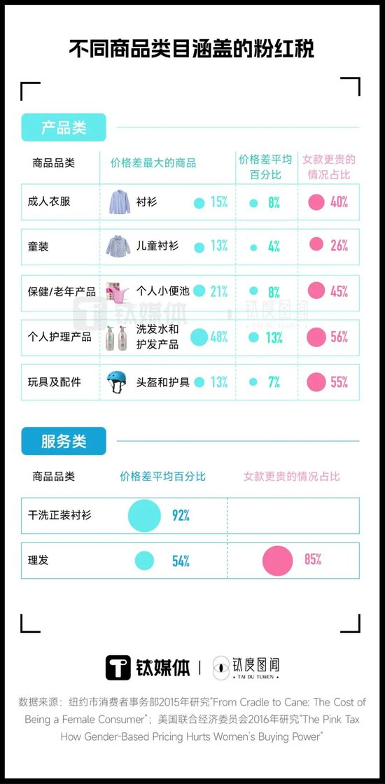 除了产品类的商品,部分服务类商品也会因性别差异而有差价。美国联合经济委员会2016年研究显示,女士正装衬衫的干洗价格要比男士衬衫高92%;在调查的100家理发店中,有85家理发店女士理发价格要比男士贵,女性支付的平均价格要比男性高54%。