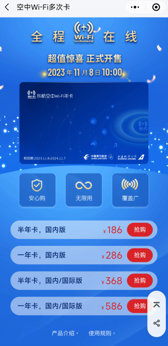 东航上线飞机“空中Wi-Fi多次卡”:不限次数 年卡286元