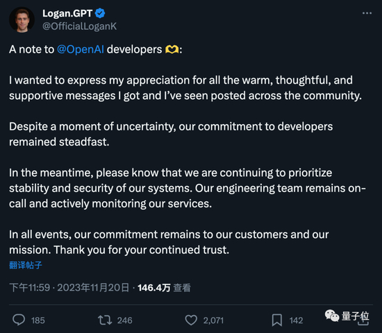 OpenAI开发者关系负责人Logan Kilpatrick表示,在动荡之中维护系统的工程团队仍在待命。