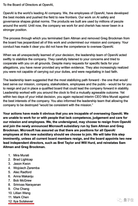 ……我们(签名人)可能选择从OpenAI辞职,并加入Sam Altman和Greg Brockman新成立的微软子公司。微软已保证,如果我们选择加入,新子公司将为所有OpenAI员工提供职位。除非所有现任董事会成员辞职,并且任命两位新的独立董事。
