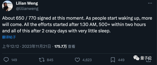 OpenAI当前员工总数约770人,500多人在两个小时内就完成签署,截止最新数据已有超过95%的员工加入进来。