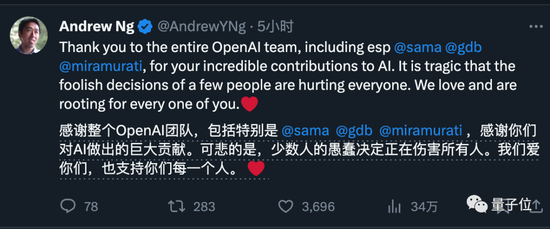 我们全体仍将一起工作,以某种形式(留在OpenAI)或另一种形式(加入微软),而且我很兴奋。