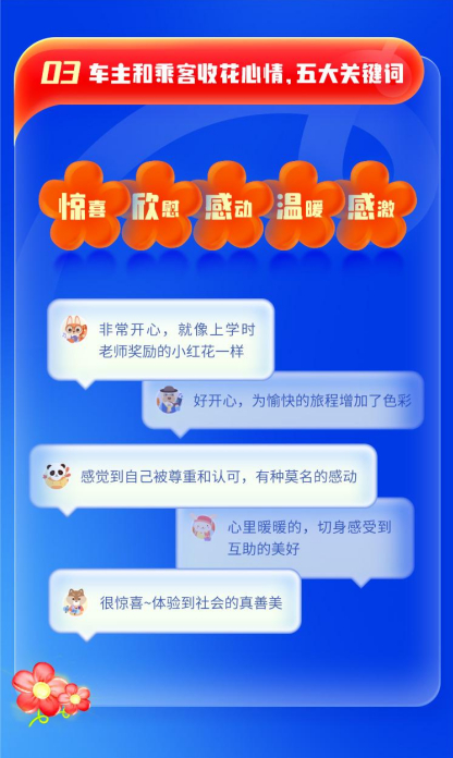 三、车主和乘客的送花热情主要来源于:不期而遇的志同道合、善解人意、鼓励和善意。送花心情关键词前五是:愉悦、舒坦、美滋滋、能量满满、有成就感。
