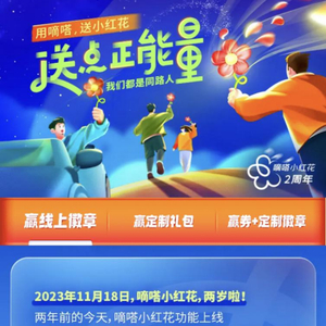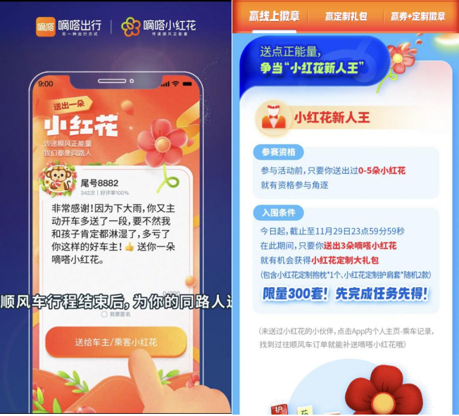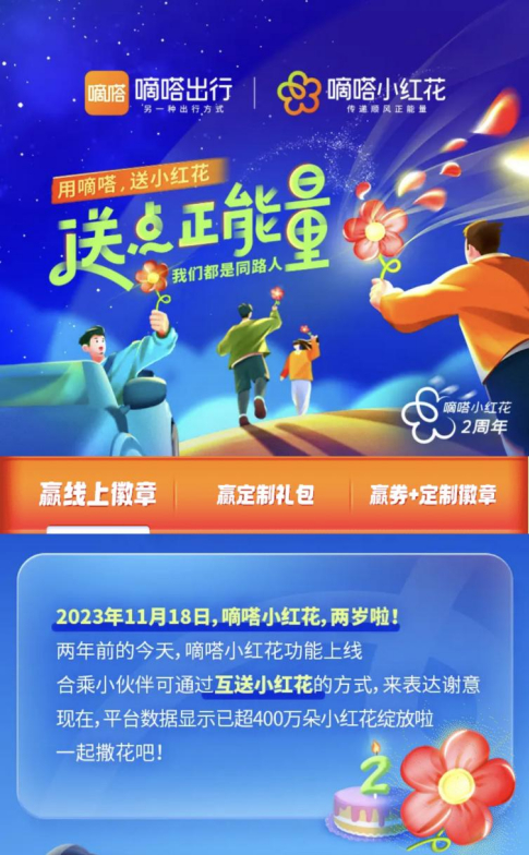 在嘀嗒小红花两周年之际,嘀嗒出行面向全网发起首届“送花有奖挑战赛”,即日起,用户可在嘀嗒出行App参与不同形式的送花活动,包括“送出一朵花”、角逐“小红花新人王”、冲榜“小红花送花王”,从而有望点亮小红花2周年纪念徽章,获得更丰厚的嘀嗒小红花周边礼品和出行优惠券等,进一步营造送点正能量的浓厚氛围。