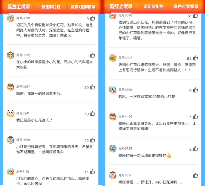 “新人王”、“送花王”将在12月揭晓。目前来看,用户参与热情高涨,活动发起当天,车主单日送花数量较往日增长超10倍,乘客送花增长超2倍。很多用户在留言区分享了送花的喜悦,希望成为送花达人,给同路人带去更多温暖和正能量。