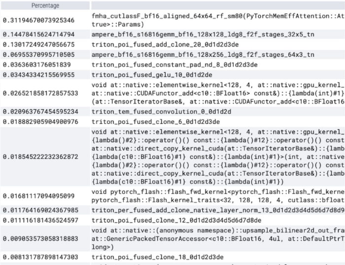 该研究表示,本文利用的 SAM 基线数据类型为 float32 dtype、batch 大小为 1,使用 PyTorch Profiler 查看内核跟踪的结果如下:
