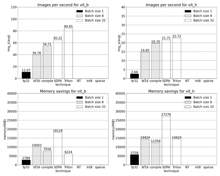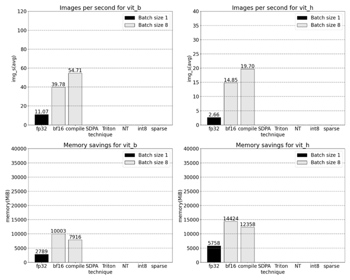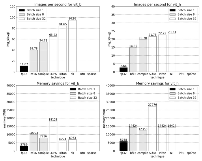 之后,该研究又实验了 Triton,NestedTensor 、批处理 Predict_torch, int8 量化,半结构化 (2:4) 稀疏性等操作。