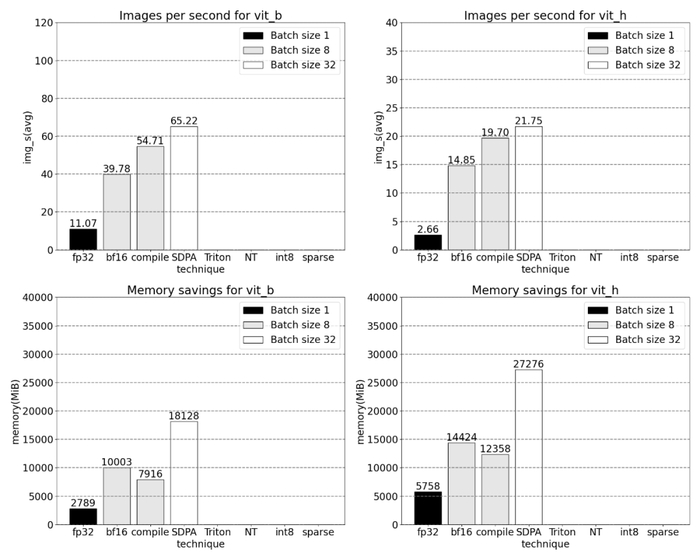 使用 PyTorch 的原生 scaled_dot_product_attention,可以显著增加批处理大小。下图为批大小为 32 及以上的变化。
