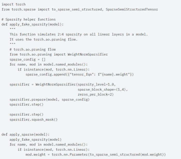为了使用这种稀疏存储格式和相关的快速内核,接下来要做的是剪枝权重。本文在 2:4 的稀疏度下选择最小的两个权重进行剪枝,将权重从默认的 PyTorch(“strided”)布局更改为这种新的半结构化稀疏布局很容易。要实现 apply_sparse (model),只需要 32 行 Python 代码: