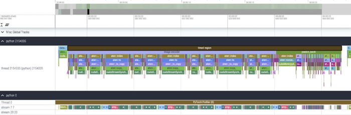 在应用了这些更改之后,本文注意到单个内核调用之间有着显著的时间间隔,尤其在小批量(这里为 1)时更为突出。为了更深入的了解这一现象,本文开始对批大小为 8 的 SAM 推理进行性能分析: