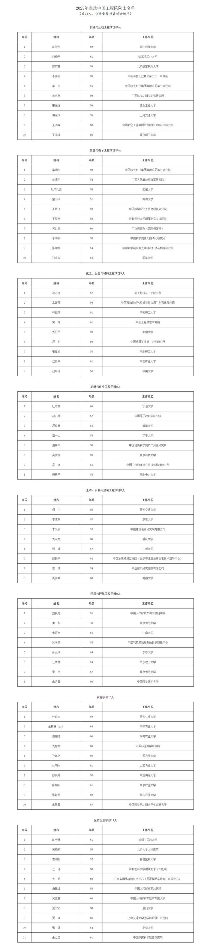 2023年共选举产生中国工程院院士74人,院士队伍的学科分布和年龄结构进一步优化。