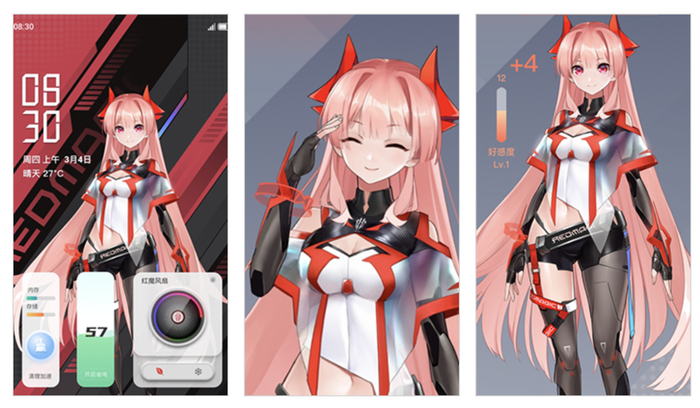 IT之家注:“红魔姬”是红魔游戏手机搭载的二次元智能助手,也支持安装在第三方手机,这款助手有点类似黑鲨的“鲨鲨酱”,可以为用户播报语音提醒,此外用户可以将红魔姬设置为桌面动态背景,还可以为其更换服装。