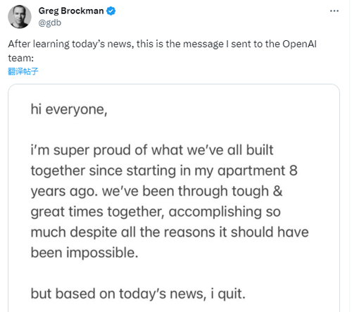结果Sam Altman的离开就像是一个多米诺骨牌,导致了一连串的反应,同一天另一位高层也宣布离职,顺带还离开了几位高级研究员。