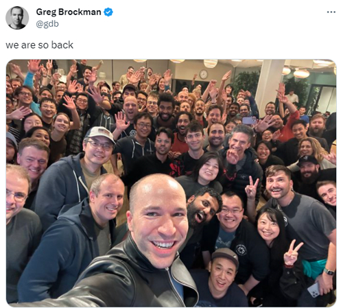 更离谱的是OpenAI也直接后院起火,据说是几乎全部员工写信威胁要离开公司,跳槽到微软。甚至发起开除Sam Altman的高层也有跳反的,转过头来支持他回归。