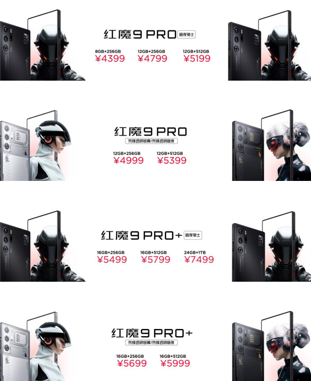 红魔9 Pro系列拥有暗夜骑士版、氘锋透明银翼、氘锋透明暗夜版三大版本及多个存储配置供选,红魔9 Pro售价4399元起,红魔9 Pro+售价5499元起。