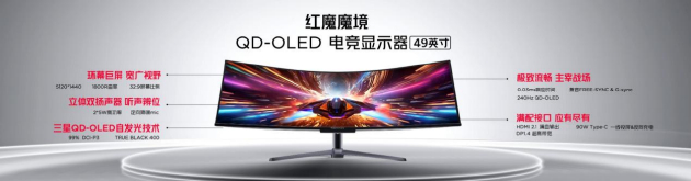 红魔魔境·QD-OLED电竞显示器 49英寸版采用了三星量子点OLED面板,屏幕比例32:9,曲率1800R,同时配备240Hz的高刷新率,为玩家带来沉浸式大屏电竞体验。魔境 49寸,QD-OLED电竞显示器售价9499元,首发尝鲜价8999元。