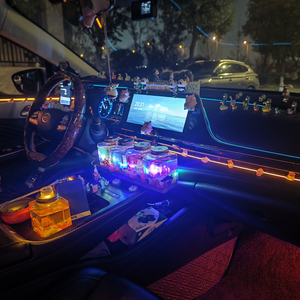 他饶有兴致地向记者介绍了车内摆件:中控屏上方的几只熊猫,是接儿子放学时买的,儿子喜欢,就多买了几个放车上;其他的小猪、小鸭子、小天鹅等,是跑网约车时,随手在路边小店、批发市场或夜市里面淘来的;车内还分别有5条用小瓶子养的金鱼,有斗鱼、波妞、珍珠三个品种,养金鱼是他的爱好。琳琅满目的小摆件,加起来有上百个,花费不过200多元,在车内灯带的照射下,显得温馨治愈。