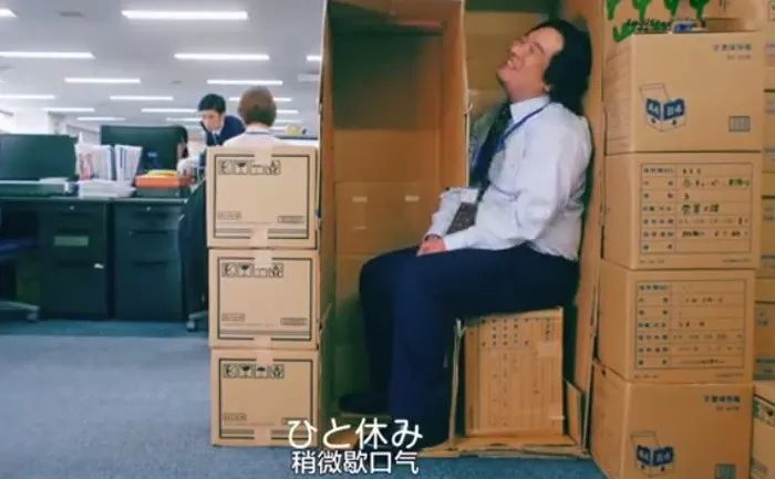 2019年BOSS上线了一支叫做“偷懒革命”的广告,在广告中,日本歌手冈崎体育饰演的办公室白领,配合着欢快的BGM,向观众介绍他的办公室摸鱼心得,比如躲在纸箱的空隙中歇口气: