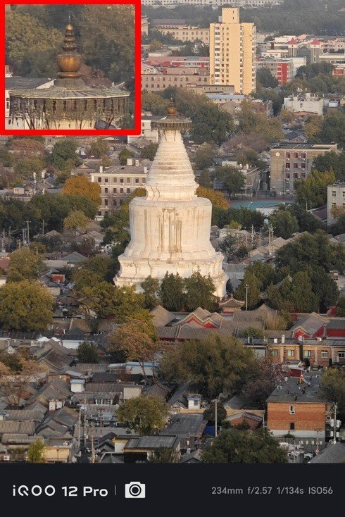 放大白塔的顶端部分,iQOO 12 Pro的塔尖明显要比iPhone 15 Pro拍出来的要清晰很多,至少能看清垂下的镂空装饰;而iPhone 15 Pro拍出来的就是糊成一片,完全比不了。