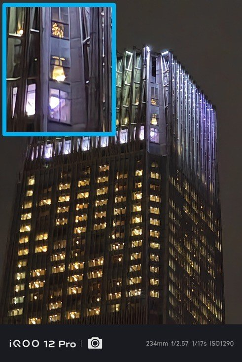 最后我们再来对比一下夜景长焦的拍照效果,这是用10X长焦拍出来的大厦,可以看到在iQOO 12 Pro在高ISO环境下拍摄出的长焦样张细节也较为干净,没有明显的涂抹痕迹;