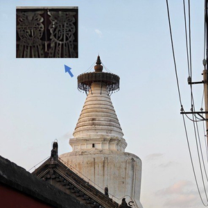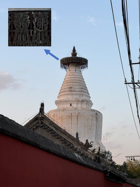 大致看完色彩,我们放大来看看细节。就以白塔顶端周围的“佛”字为对比,iQOO 12 Pro拍出的字体边缘锐利,与阴影处对比明显;iPhone 15 Pro的“佛”就没那么清晰了,左边的镂空图案更是一片模糊。