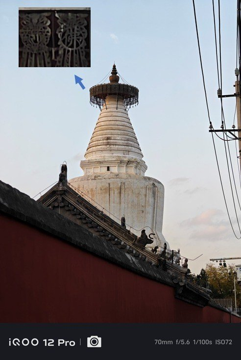 再看一组日间样张吧,这是另一个角度的白塔,iPhone 15 Pro拍出来的画面映上了落日的色彩,整体画面偏黄;iQOO 12 Pro拍出来的效果比较还原真实。