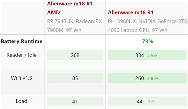 同样是97Whr电池,m18 Intel/NVIDIA版本待机、上网场景分别可坚持334分钟、260分钟,AMD版本就只有268分钟、85分钟,尤其上网时竟然差了足足三倍。