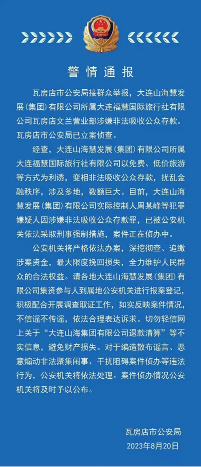 一则瓦房店市公安局的警情通报称,大连某慧国际旅行社有限公司以免费、低价旅游等手段为利诱,变相非法吸收公众存款,扰乱金融秩序,涉及多地,且数额巨大。