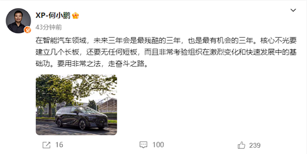 就在今日,小鹏汽车CEO何小鹏发布微博称: