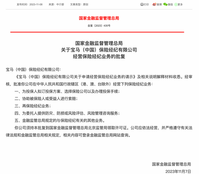 宝马(中国)则成立了一家宝马(中国)保险经纪有限公司,并在2023年11月8日获得国家金融监督管理总局批准的保险经纪业务许可,这是时隔五年之后,中国保险行业监管机构首次批准新的保险经纪业务许可。