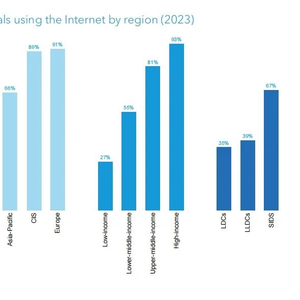 ·全球范围和每个地区的互联网使用量都在增加——54亿人(相当于世界人口的67%)正在使用互联网。在欧洲、独联体和美洲,大约90%的人口使用互联网。阿拉伯国家和亚洲及太平洋地区大约三分之二的人口使用互联网,与全球平均水平一致。然而,目前非洲只有37%的人口使用互联网。