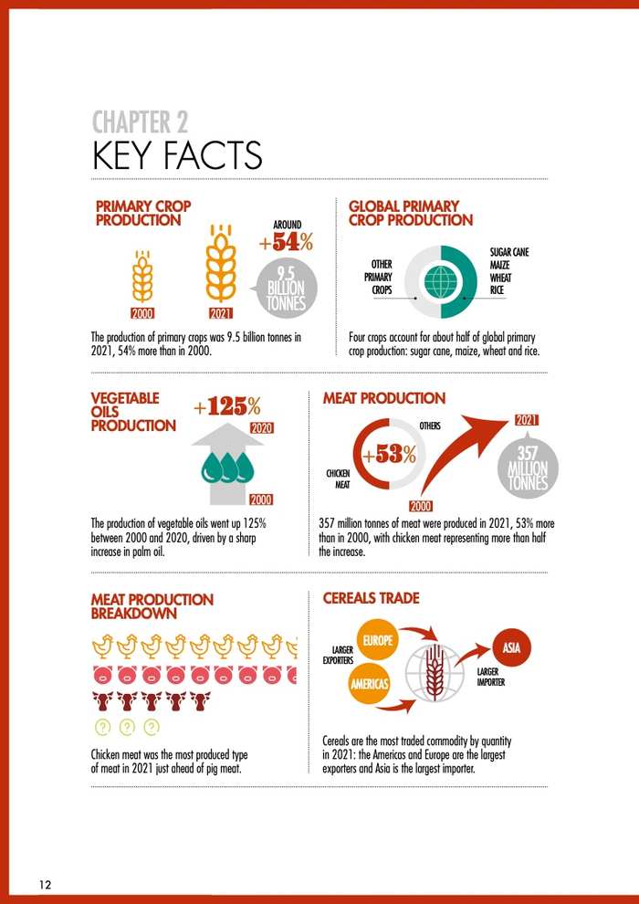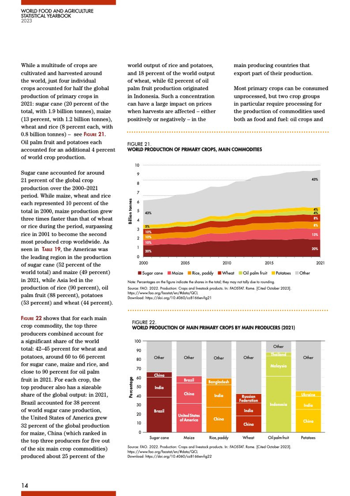 2000年到2021年期间,主要农作物的产量增长了54%,达到95亿吨。四大主要作物(甘蔗、玉米、小麦和水稻)占总量的一半。