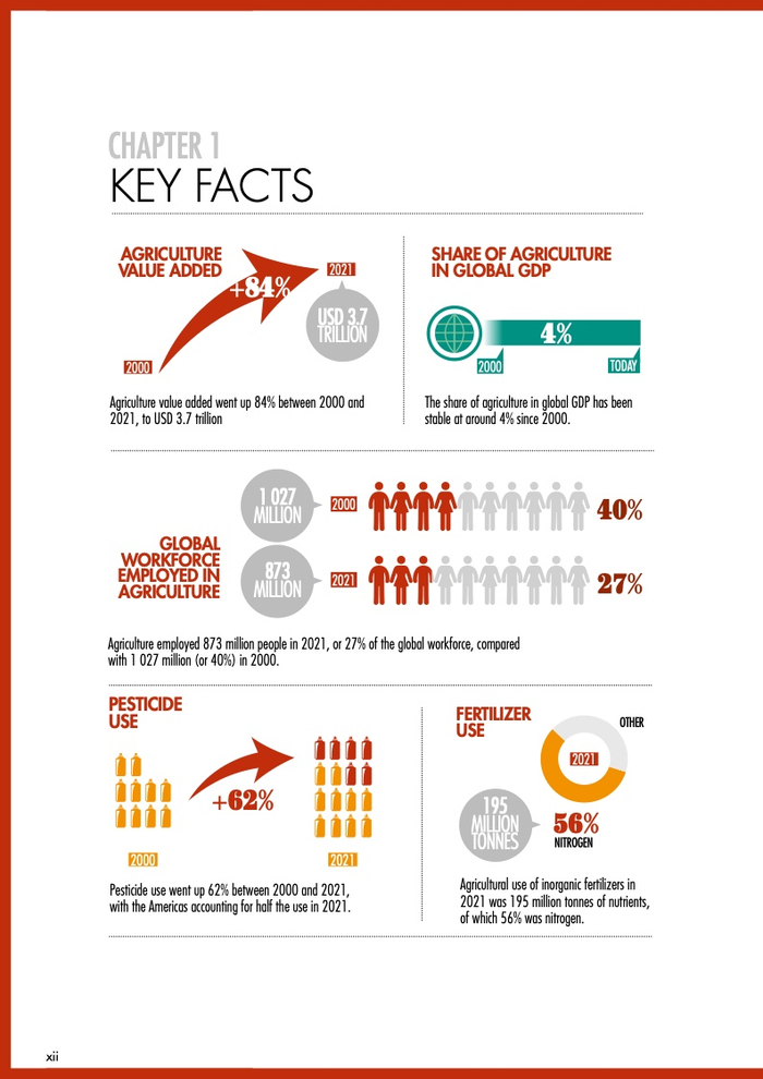 2000年到2021年期间,农业、林业和渔业的全球生产总值实际增长84%,在2021年达到3.7万亿美元。