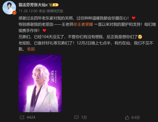 结束虎牙最后一次直播后,知名《王者荣耀》主播张大仙停播多达100多天。直至11月26日,张大仙官宣,将于12月2日晚在抖音开启直播首秀,至此张大仙的“下家”才最终浮出水面。