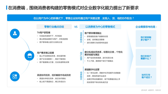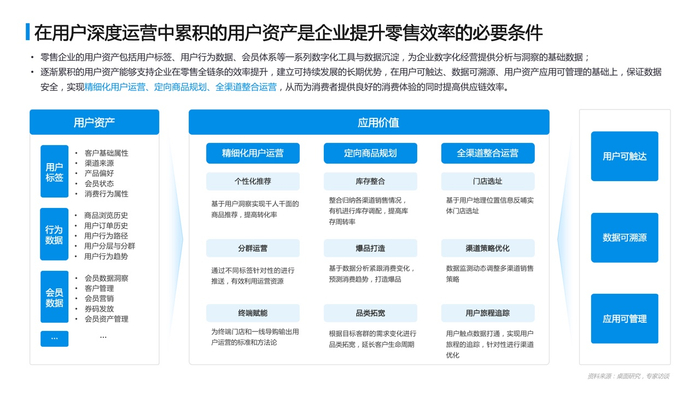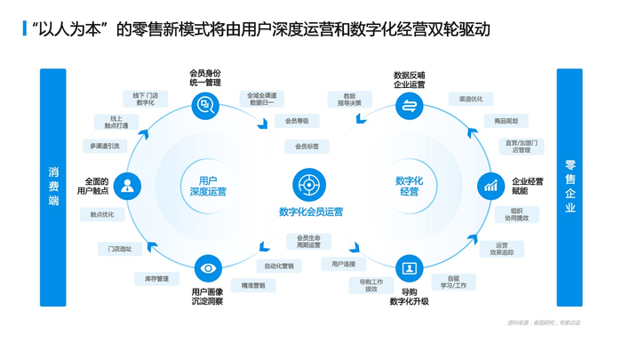 数字化转型已为零售企业在渠道管理上提升效率,而随着零售行业进入到“以人为本”的经营时代,零售企业需要构建围绕消费者构建全新的运营模式。我们认为,用户深度运营和数字化经营将成为企业开启全面数字化的战略重心: