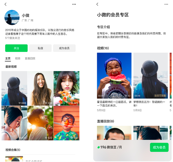 达人可发布短视频、直播、问答、直播回放等会员专属内容,并设置单月或连续包月付费。单月费用在84-1316微信豆(iOS手机12-188元,Android手机8.4-131.6元),需达人自行设置。据悉,在测试阶段,会员专区不支持关闭,单月费用也不可调整。