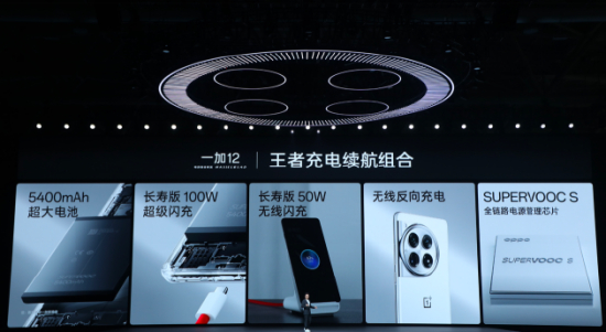 在续航上,一加 12 拥有 5400mAh 大电池+100W 超级闪充+50W 无线闪充的续航王者组合,26 分钟即可将电量从 1% 充至 100%,实测 DOU 达到 1.79 天,日常使用毫无压力,彻底告别续航焦虑。充电既要快,又要安全,还要不损伤电池。为了达成充电体验提升,一加 12 搭载 OPPO 首颗电源管理芯片和多项自研算法,既能在电量低时闪速充电,又能在检测到温度异常时开启温控与久充保护。此外,一加 12 还搭载了智能电池健康算法和仿生修复电解液技术,减少电池容量损耗,使用 4 年以后,电池有效容量依然大于 80%。