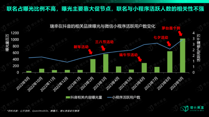 增长黑盒发布的《瑞幸联名营销研究报告》显示,实际上,瑞幸的用户增长不是靠堆叠联名场次来拉动的,其整体营销战略还是围绕大促节点、上新周期来打。每年联名营销活动的相关社媒内容,给瑞幸带来的线上声量贡献不到10%(排除9月茅台联名个例)。