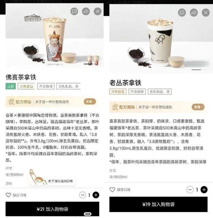 11月28日,喜茶和景德镇中国陶瓷博物馆联名的“佛喜茶拿铁”上线。联名款以景德镇博物馆藏品《釉下加彩十八罗汉塑像》为灵感,推出了以“无语菩萨”“欢喜罗汉”“伏虎罗汉”为主题的三款奶茶杯及周边产品。