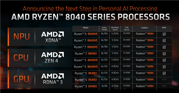 锐龙8040系列仍然基于Zen4 CPU架构、RDNA3 GPU架构、XDNA NPU架构,通过进一步挖掘潜力,尤其是提升各部分的频率和效率,带来更上一层的AI性能。