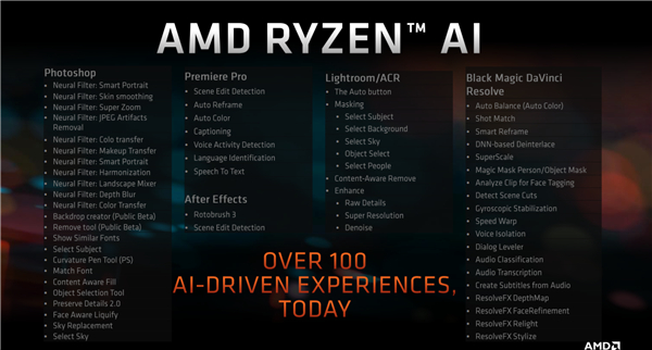 Ryzen AI驱动的加速功能目前也已有100多个,尤其是在Adobe Photoshop、Premiere Pro、After Effect、Lightroom等创意设计软件中,大量的日常操作都可以从中获得极大的效率提升。