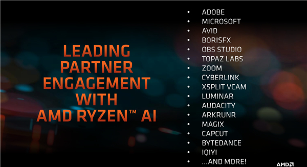 Ryzen AI的应用也不断拓展,合作伙伴包括Adobe、微软、Avid、Bori SFX、OBS Studio、Topaz Labs、Zoom、Cyberlink、XSplit VCam、Luminar、Audacity、Arkrunr、Blackmagic Design、Capcut,以及国内的字节跳动、爱奇艺,等等。