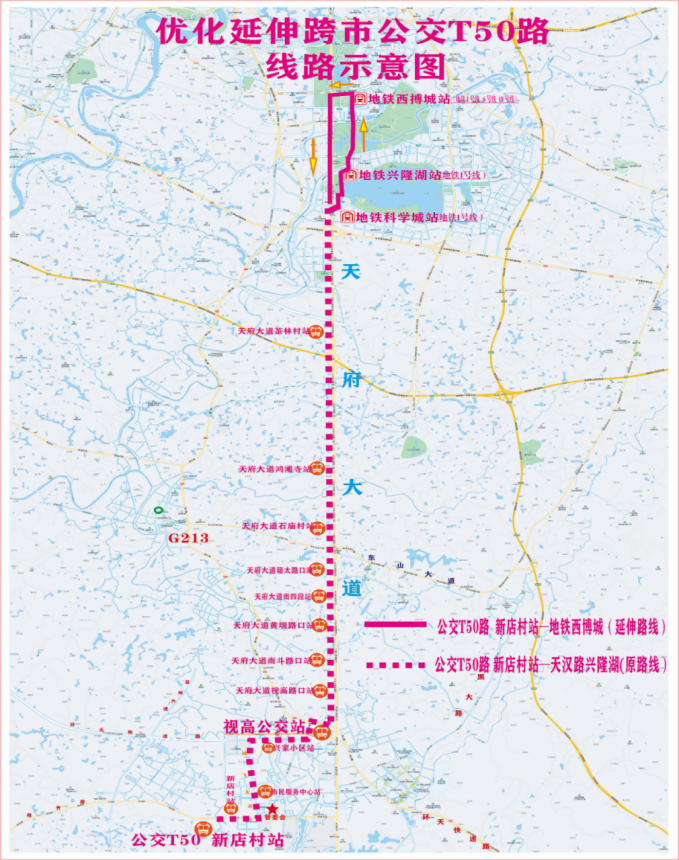 优化后延伸路段走向为绕行线路,途经科学城地铁站B出口,由兴隆湖(湖畔路西段)至蜀州路,线路止于地铁西博城站停靠,采用即停即走的方式,线路返回途经福州路西段、天府大道南二段至地铁科学城站A1出口,再返回公交T50路原线路。