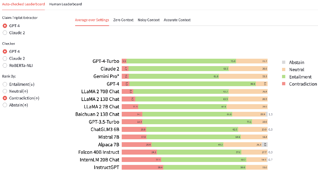 他们使用 BSChecker 的自动检测框架对 Gemini 进行了幻觉检测,将 GPT-4 作为声明抽取器和幻觉检测器,在无上下文场景下按照矛盾比例进行排名(和上述推荐设置一致),得到的结果与 Gemini 报告中的实验结果一致。他们还进一步对其中的 10 个输出文本进行了人工标注,其中共包含 118 个声明三元组,标注结果显示自动检测和人工标注的一致性达到了 90.7%。