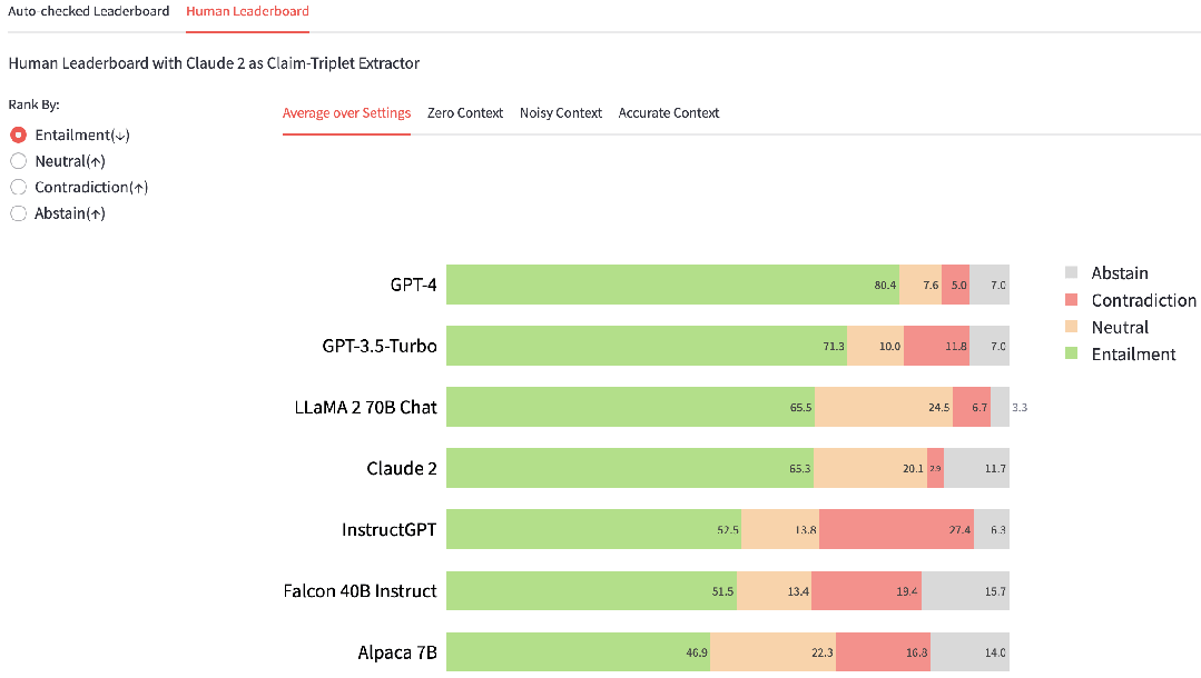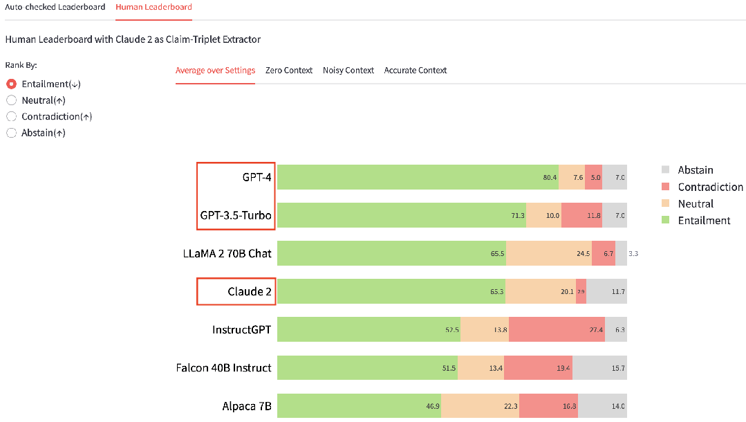 BSChecker 目前收录了 2100 个经过细粒度人工标注的大模型输出文本,涵盖了 7 个主流大模型,如 GPT-4、Claude 2、LLaMA 2 等。基于这个结果,作者构建了一个交互式的排行榜,见下图。人工评估排行榜包含两个可交互的选项:1)上文中提到的三种任务场景,以及三种场景上平均的结果(顶部选项);2)评估指标(左侧 “排名依据” 选项)。下图显示了依据蕴涵排名得到的排行榜。