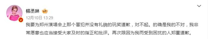 12月9日,有视频显示,歌手杨丞琳在郑州演唱会上与歌迷交流时,说出河南人“爱骗人”相关话语。事情传播到网上后,引起一些网友不满。杨丞琳随后发文道歉;当地相关单位表示,接到了市民对此事的投诉,表示正在落实处理中。