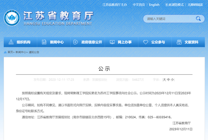 12月11日,江苏省教育厅发布常熟理工学院拟更名为苏州工学院相关事项公示。